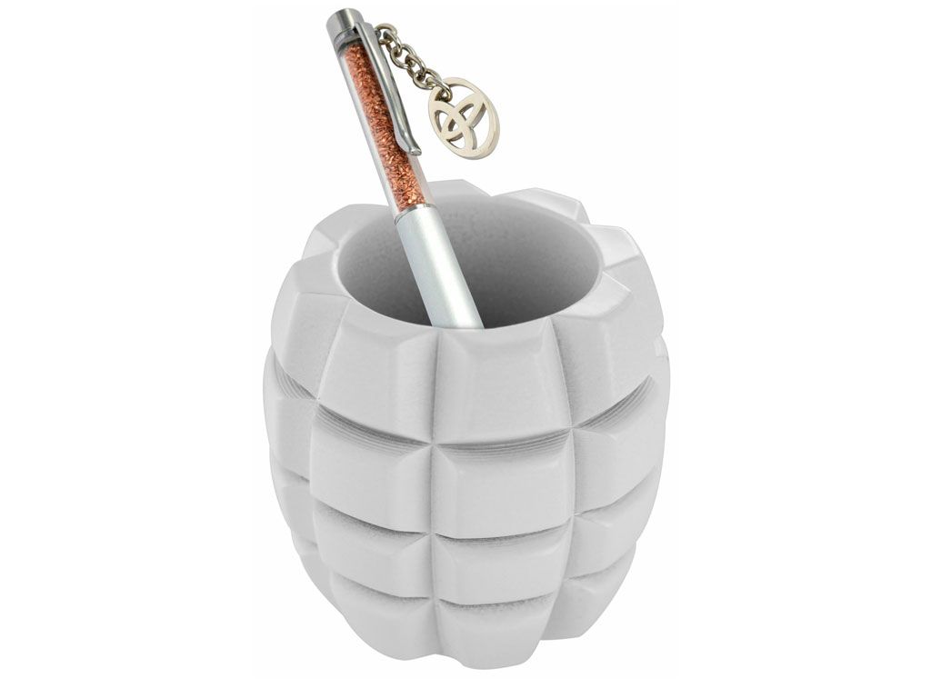 7.5 x 5.5 cm. Pot à stylos résine blanche d’origine sans stylo. Marquage tampographie.